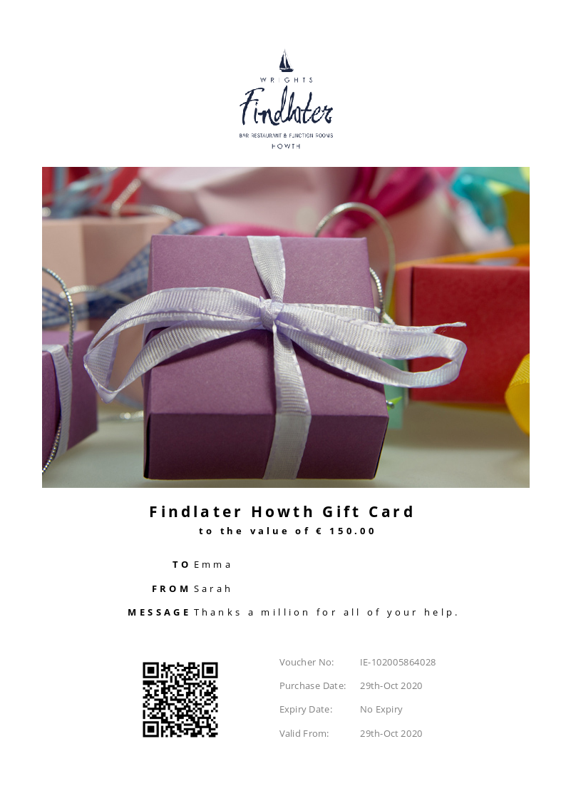 Buy a Findlater Howth Gift Card for an amount of your choosing. Send it to someone special or treat yourself instead.